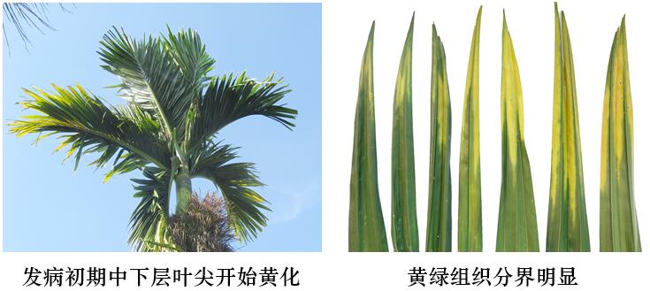 三、及時清理病株。及時清除樹冠最下部病葉枯葉;對于整個樹冠葉片都黃化甚至枯死,或樹冠縮小一半以上甚至枯頂的病株,應整株清除。發(fā)病率達70%以上的特重檳榔黃化病園,建議全園更新。