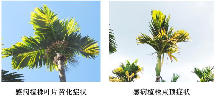 檳榔長線形病毒黃化病是檳榔生產中新發(fā)現的一種重要病害,發(fā)病初期主要引起檳榔樹冠中下層葉片黃化,通常從葉尖開始變黃,黃化和綠色組織分界明顯,后期黃化癥狀擴展到幼葉和上層葉片,發(fā)病嚴重時新葉無法正常展開,樹冠冠幅明顯減小,萎縮成束頂狀,喪失結果能力,最后整個樹冠黃化甚至枯頂死亡。9—12月,檳榔病蟲害監(jiān)測與防控項目專家組對海南省檳榔黃化發(fā)生危害情況開展調查和采樣檢測,發(fā)現檳榔長線形病毒黃化病發(fā)生普遍,在萬寧、瓊海、屯昌、保亭、三亞、定安、文昌、陵水、樂東、???、澄邁、五指山、儋州等市縣均有發(fā)生,平均發(fā)病率高達70%以上。