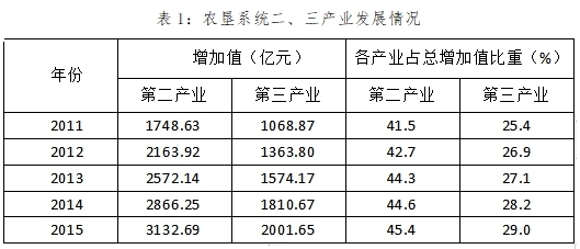 《中國(guó)農(nóng)墾統(tǒng)計(jì)年鑒》顯示,從2011年至2015年,農(nóng)墾系統(tǒng)二、三產(chǎn)業(yè)增加值持續(xù)上升,2014年和2015年第三產(chǎn)業(yè)的增加值占比均超越了第一產(chǎn)業(yè),詳見(jiàn)表1。