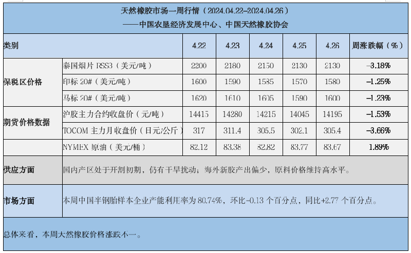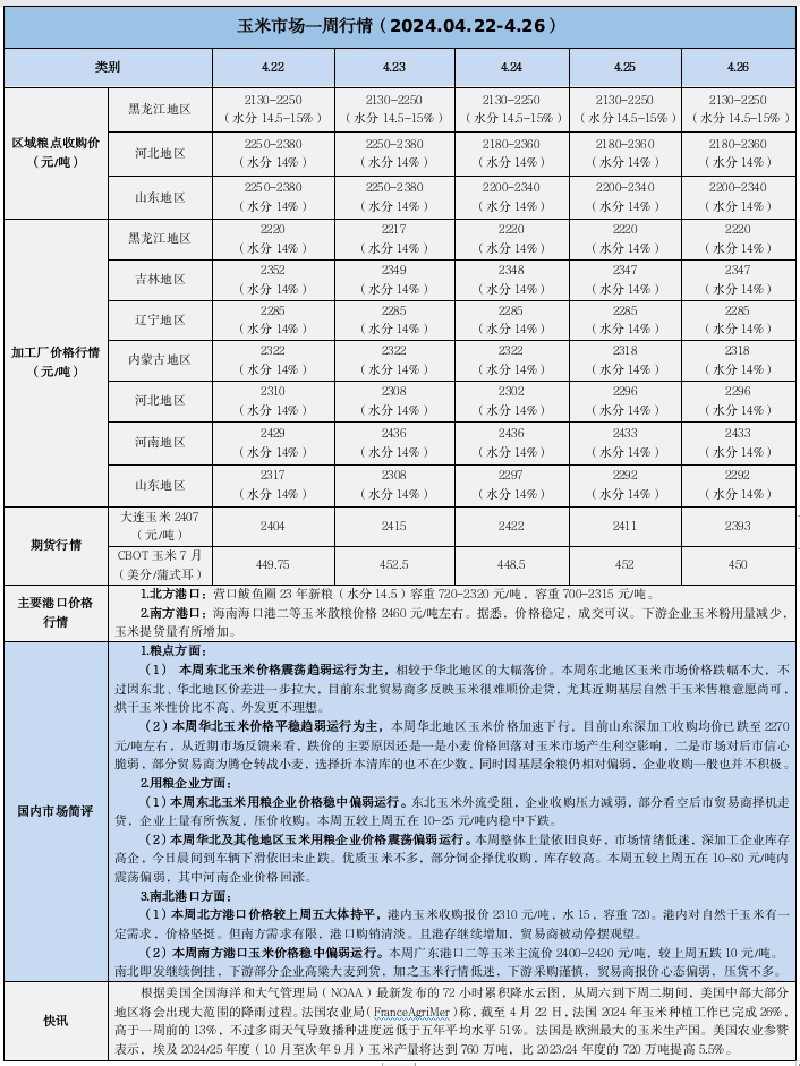 天然橡膠、大豆、玉米市場一周行情(2024.04.22-04.26)