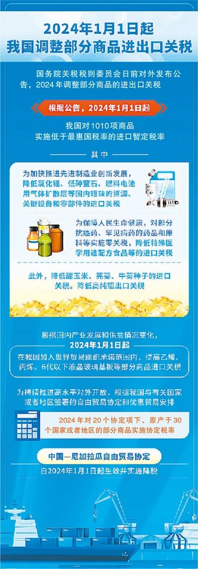 根據(jù)最新發(fā)布的2024年關(guān)稅調(diào)整方案(以下簡(jiǎn)稱“方案”),1月1日起,中國(guó)對(duì)1010項(xiàng)商品實(shí)施低于最惠國(guó)稅率的進(jìn)口暫定稅率。
