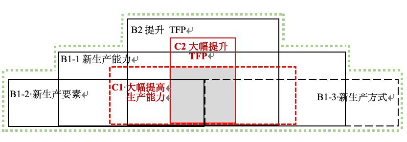 兩個(gè)必要條件。必要條件一是至少要滿足如下3個(gè)條件之一。(1)B1-1:提高了生產(chǎn)能力,產(chǎn)品包括已有產(chǎn)品、改善的產(chǎn)品、新的產(chǎn)品和促進(jìn)公平與綠色等高質(zhì)量發(fā)展的產(chǎn)品。(2)B1-2:生產(chǎn)上利用了新的生產(chǎn)要素,包括能力得到提升的勞動(dòng)者、質(zhì)量安全等得到改善的生產(chǎn)要素和新的生產(chǎn)要素(例如,數(shù)據(jù)、信息、知識(shí)、新技術(shù)等)。(3)B1-3:生產(chǎn)上采用了新的生產(chǎn)方式,是“勞動(dòng)者、勞動(dòng)資料、勞動(dòng)對象”的“優(yōu)化組合”及其“體制機(jī)制創(chuàng)新”等的體現(xiàn)。必要條件二是新的全要素生產(chǎn)率必須高于舊的全要素生產(chǎn)率。實(shí)踐中可以通過“科技創(chuàng)新和改革創(chuàng)新”等促進(jìn)新的生產(chǎn)要素和新的生產(chǎn)方式等采用來提高全要素生產(chǎn)率。新質(zhì)生產(chǎn)力的內(nèi)涵范圍見圖1中外圍。