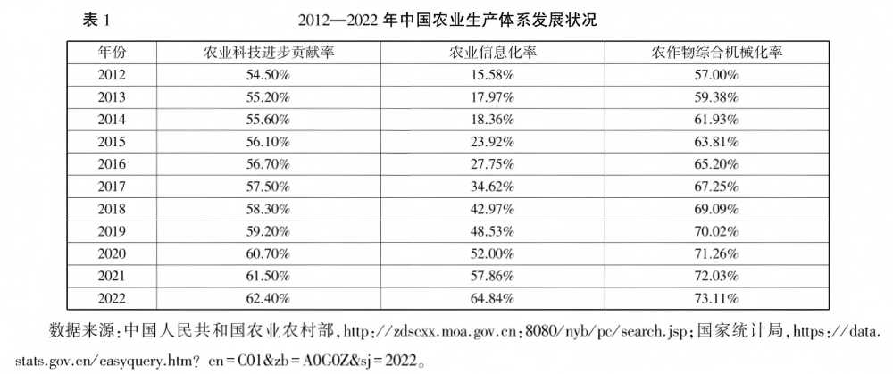 現(xiàn)代化農(nóng)業(yè)生產(chǎn)體系意味著先進(jìn)生產(chǎn)手段和生產(chǎn)技術(shù)的有機(jī)結(jié)合,重點(diǎn)解決的是農(nóng)業(yè)的發(fā)展動(dòng)力和生產(chǎn)效率問題。構(gòu)建現(xiàn)代化農(nóng)業(yè)生產(chǎn)體系能夠使得一個(gè)國(guó)家的農(nóng)業(yè)生產(chǎn)率突破自然條件的限制,實(shí)現(xiàn)生產(chǎn)力的高效提升。考察現(xiàn)代化農(nóng)業(yè)生產(chǎn)體系建設(shè)情況,可以從農(nóng)業(yè)生產(chǎn)率、農(nóng)業(yè)科技貢獻(xiàn)率、農(nóng)業(yè)信息化率、農(nóng)業(yè)機(jī)械化率以及農(nóng)業(yè)資本有機(jī)構(gòu)成等幾個(gè)核心指標(biāo)出發(fā)。此外,生態(tài)可持續(xù)性也是生產(chǎn)發(fā)展的重要考量維度,本文此以農(nóng)藥化肥投入水平考察農(nóng)業(yè)生態(tài)發(fā)展情況。