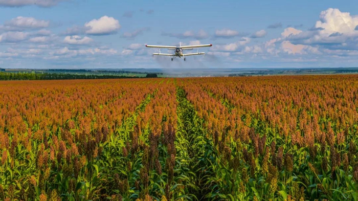《插上科技的翅膀》 北大荒農(nóng)墾集團(tuán)九三分公司鶴山農(nóng)場(chǎng)飛機(jī)植保作業(yè)。岳靜華 攝
