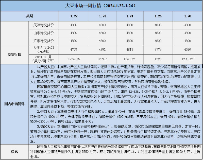天然橡膠、大豆、玉米市場一周行情(2024.1.22-1.26)