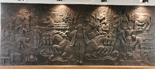場(chǎng)史館主題銅質(zhì)浮雕由中央美院壁畫(huà)系教師杜飛制作,位于館中心,與正門(mén)相對(duì),長(zhǎng)6米,高2米。浮雕以“十六掛馬車(chē)建場(chǎng)”為主題,集中反映了農(nóng)場(chǎng)艱苦創(chuàng)業(yè)、奮斗、勇于開(kāi)拓的輝煌歷程。