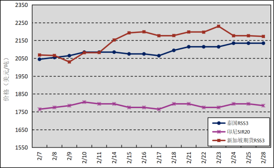 國外主產(chǎn)區(qū):2月,泰國RSS3平均價(jià)格為2093美元/噸,環(huán)比上漲44美元/噸,最高價(jià)為2135美元/噸,最低價(jià)為2045美元/噸;印尼SIR20平均價(jià)格為1784美元/噸,環(huán)比上漲11美元/噸,最高價(jià)為1805美元/噸,最低價(jià)為1765美元/噸;新加坡RSS3期貨主力合約月均結(jié)算價(jià)格為2149美元/噸,環(huán)比上漲161美元/噸,最高價(jià)為2230美元/噸,最低價(jià)為2030美元/噸。