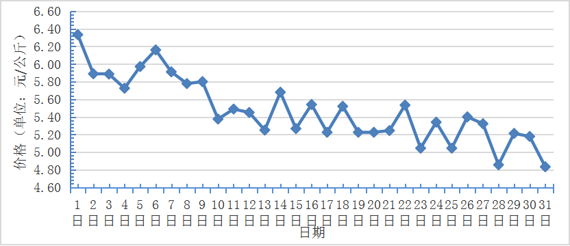7月,全國重點監(jiān)測農(nóng)產(chǎn)品批發(fā)市場香蕉總交易量達2.2萬噸,同比下降4.3%,環(huán)比上漲4.8%;總交易價值11932.6萬元,同比下降6.4%,環(huán)比下降2.8%。日平均價格最高為6.3元/千克,最低為4.8元/千克,全月平均價格為 5.5元/千克,同比下降6.7%,環(huán)比下降14.1%(每日價格變化如圖)。