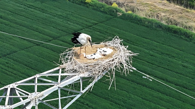 在濱淮農(nóng)場養(yǎng)殖中心旁的兩座電力鐵塔上,由枯枝搭建的巨型鳥巢格外醒目。被譽為“鳥界大熊貓”的國家一級重點保護野生動物東方白鸛,已連續(xù)多年在此筑巢繁衍,今年更是有兩窩共8只幼鳥破殼而出,正健康成長,成為春日濱淮農(nóng)場一道靈動的生態(tài)風景線。