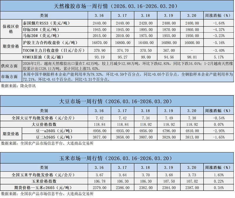 天然橡膠、大豆、玉米市場一周行情(2026.03.16-03.20)