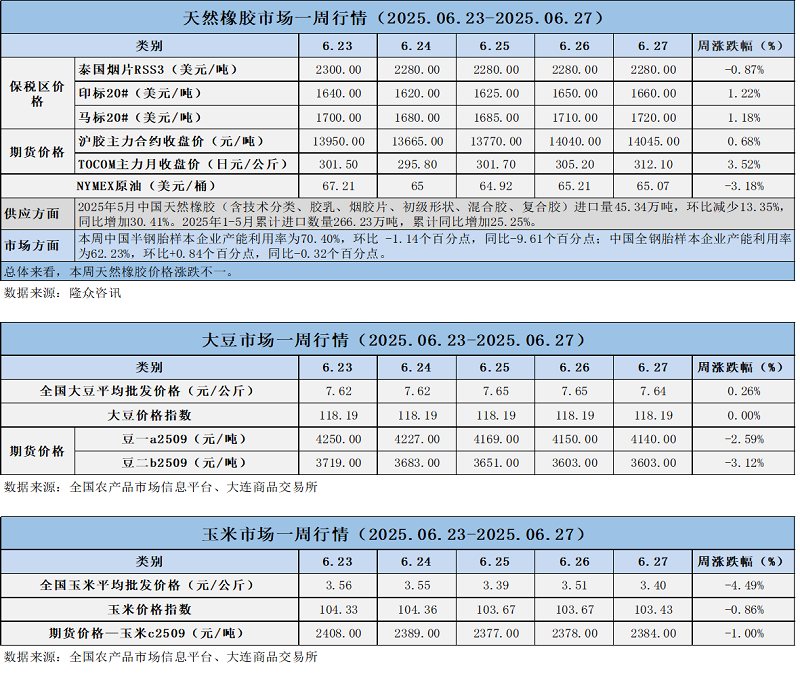 天然橡膠、大豆、玉米市場(chǎng)一周行情(2025.06.23-06.27)