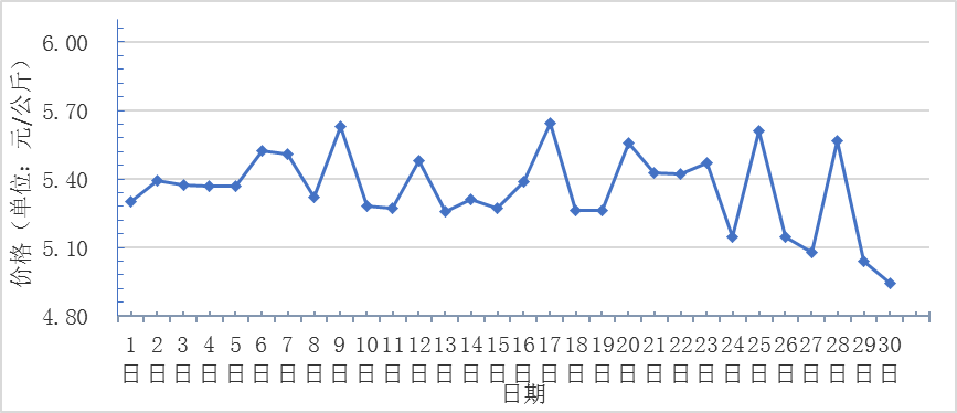 4月,全國重點監(jiān)測農(nóng)產(chǎn)品批發(fā)市場香蕉總交易量達(dá)3.1萬噸,同比增長14.8%,環(huán)比增長14.8%;總交易價值16535萬元,同比下降14.2%,環(huán)比增長15.6%。日平均價格最高為5.7元/千克,最低為5.0元/千克,全月平均價格為5.4元/千克,同比下降15.6%,環(huán)比增長1.9%(每日價格變化如圖)。