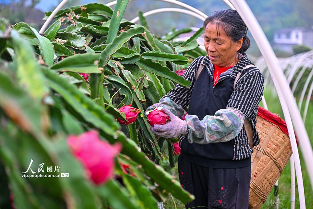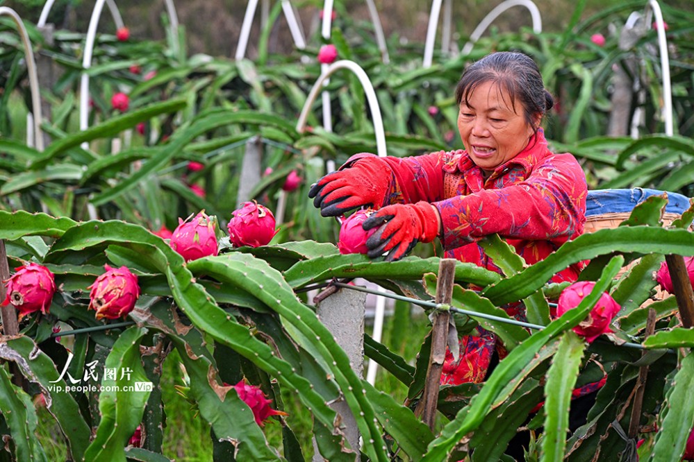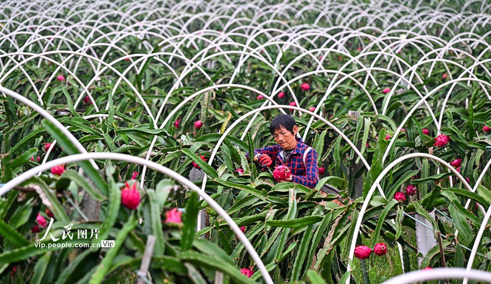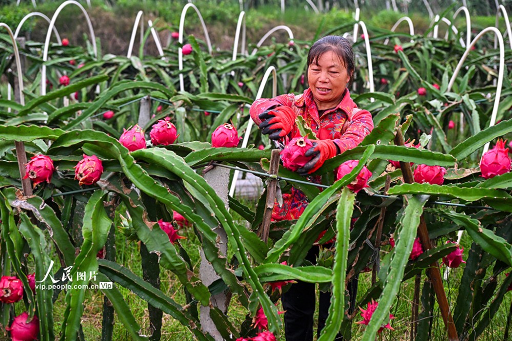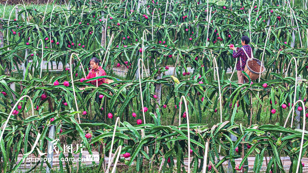 近年來(lái),當(dāng)?shù)匾虻刂埔艘?guī)?;l(fā)展火龍果、櫻桃等特色水果產(chǎn)業(yè),助力土地增效,村民增收。潘帥攝(人民圖片網(wǎng))