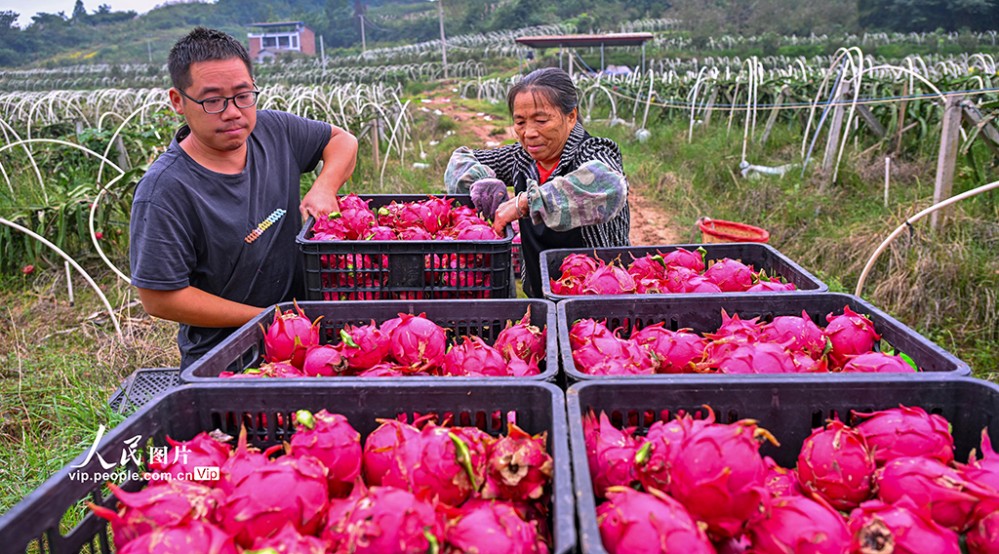 連日來(lái),四川省眉山市仁壽縣懷仁街道吊慶社區(qū)的火龍果喜迎豐收,果農(nóng)們忙著采摘、轉(zhuǎn)運(yùn),供應(yīng)市場(chǎng)。