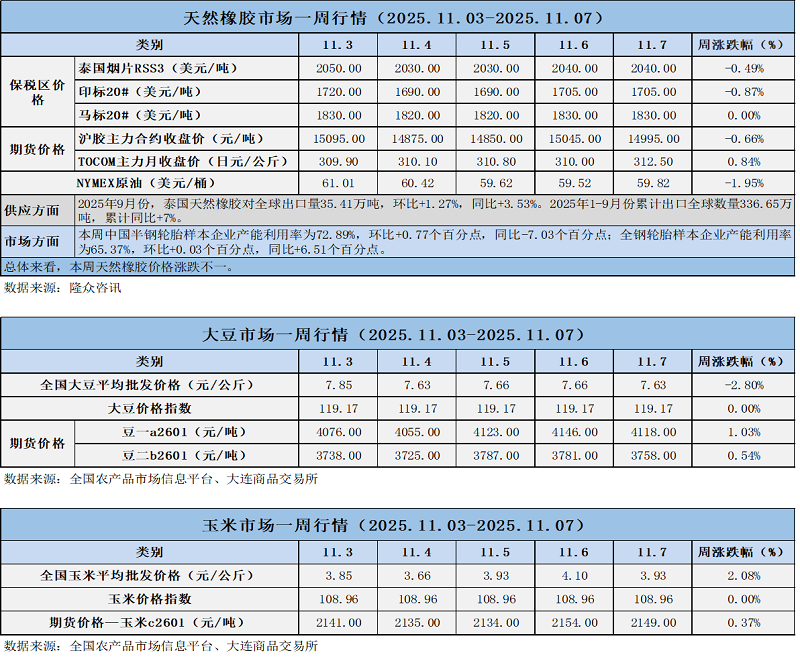 天然橡膠、大豆、玉米市場(chǎng)一周行情(2025.11.03-11.07)