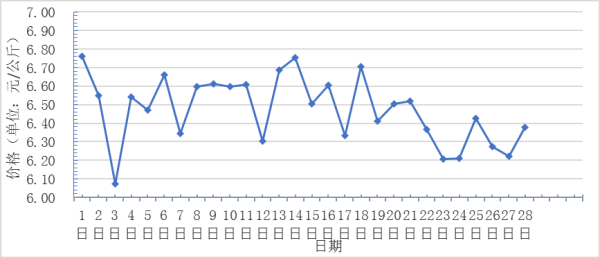 2月,全國(guó)重點(diǎn)監(jiān)測(cè)農(nóng)產(chǎn)品批發(fā)市場(chǎng)香蕉總交易量達(dá)2.4萬(wàn)噸,同比下降63.1%,環(huán)比下降75.8%;總交易價(jià)值16338.5萬(wàn)元,同比下降49.5%,環(huán)比下降72.0%。日平均價(jià)格最高為6.8元/千克,最低為6.1元/千克,全月平均價(jià)格為6.5元/千克,同比上漲22.1%,環(huán)比上漲22.1%(每日價(jià)格變化如圖)。