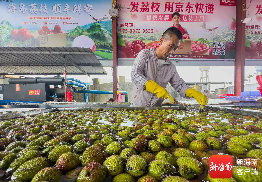 在海口金綠果水果產(chǎn)銷專業(yè)合作社服務(wù)站,村民陸續(xù)用三輪車將成熟荔枝運送過來,工人們清洗并精心挑選荔枝后,將其打包發(fā)往全國各地。