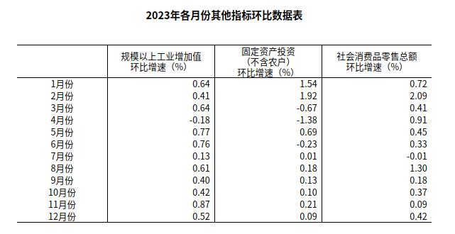(2)根據(jù)季節(jié)調(diào)整模型自動(dòng)修正結(jié)果,對近一年來各期國內(nèi)生產(chǎn)總值、規(guī)模以上工業(yè)增加值、固定資產(chǎn)投資(不含農(nóng)戶)、社會消費(fèi)品零售總額環(huán)比增速進(jìn)行修訂。修訂結(jié)果及2023年四季度GDP環(huán)比數(shù)據(jù)、2023年12月份其他指標(biāo)環(huán)比數(shù)據(jù)如下:
