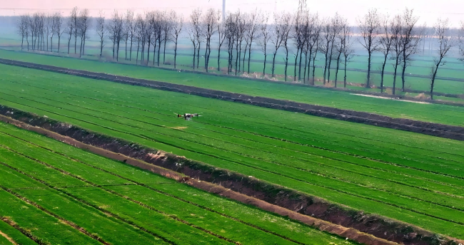 春雨綿綿潤(rùn)沃野,科技助農(nóng)正當(dāng)時(shí)。濕潤(rùn)的麥田上空,一架架植保無(wú)人機(jī)正按照設(shè)定路線穿梭作業(yè),上演著“速度與激情”?!把b肥、起飛、噴施,一氣呵成。一臺(tái)無(wú)人機(jī)每小時(shí)可施肥50畝,全天候連續(xù)作業(yè)可達(dá)千余畝。”六生產(chǎn)區(qū)負(fù)責(zé)人倪信軍說(shuō),在春雨墑情適宜的關(guān)鍵期,無(wú)人機(jī)作業(yè)不受田間路況影響,不僅效率倍增,還能有效避免傳統(tǒng)拖拉機(jī)進(jìn)田對(duì)小麥根系造成的損傷,真正實(shí)現(xiàn)精準(zhǔn)撒施、減肥增效。