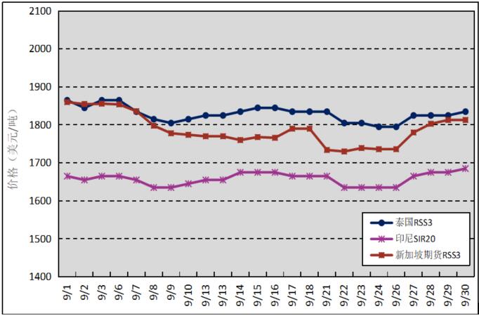 國外主產區(qū):9月,泰國RSS3平均價格為1829美元/噸,環(huán)比下跌87美元/噸,最高價為1865美元/噸,最低價為1795美元/噸;印尼SIR20平均價格為1658美元/噸,環(huán)比下跌69美元/噸,最高價為1685美元/噸,最低價為1635美元/噸;新加坡RSS3期貨主力合約月均結算價格為1788美元/噸,環(huán)比下跌115美元/噸,最高價為1860美元/噸,最低價為1730美元/噸。