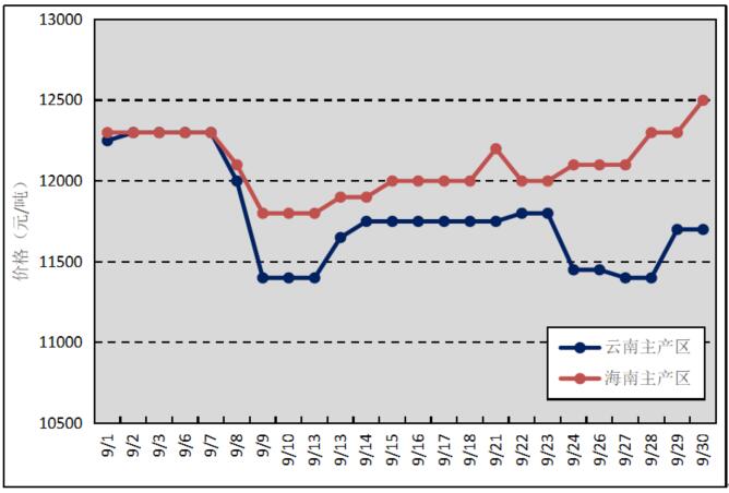 國內主產區(qū):9月,我國天然橡膠主產區(qū)步入割膠旺季。海南原料膠(折干膠)月均價格為12100元/噸,環(huán)比下跌575元/噸;云南原料膠(折干膠)月均價格為11771元/噸,環(huán)比下跌593元/噸。