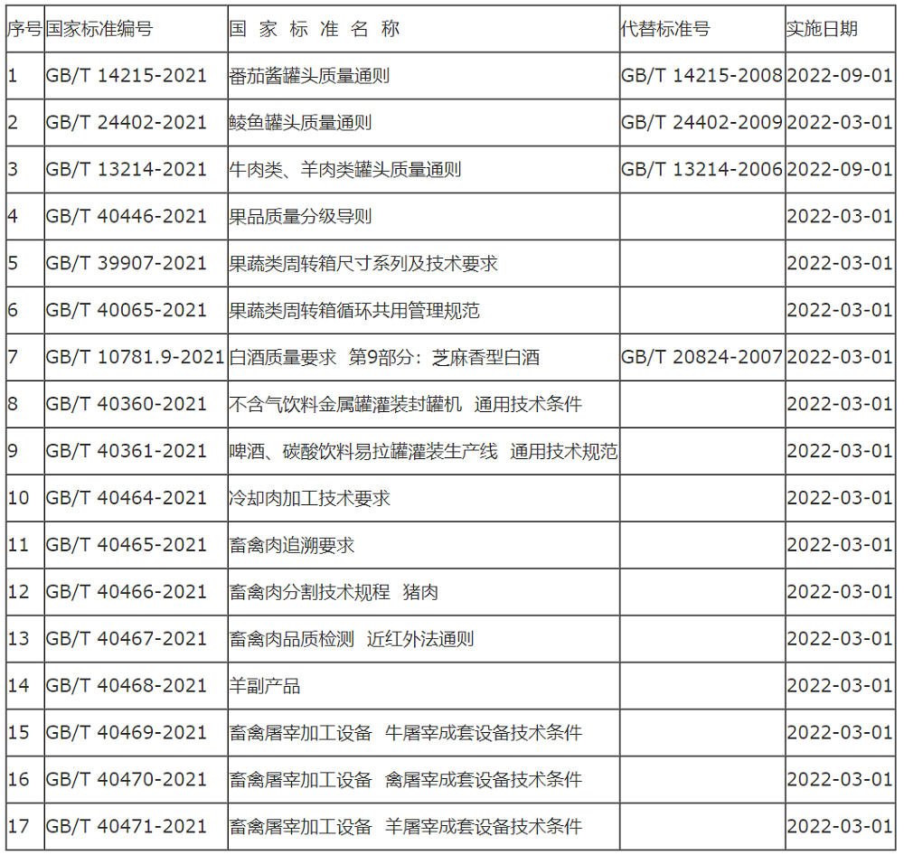 8月26日,國家市場監(jiān)督管理總局、國家標(biāo)準(zhǔn)化管理委員會聯(lián)合發(fā)布了2021年第11號國家標(biāo)準(zhǔn)公告,該公告共發(fā)布450項推薦性國家標(biāo)準(zhǔn)和4項國家標(biāo)準(zhǔn)修改單。其中,涉及3項罐頭食品通則、3項果蔬相關(guān)標(biāo)準(zhǔn)、3項酒類飲料相關(guān)標(biāo)準(zhǔn)以及多項畜禽肉等加工技術(shù)標(biāo)準(zhǔn)。詳情見下表。