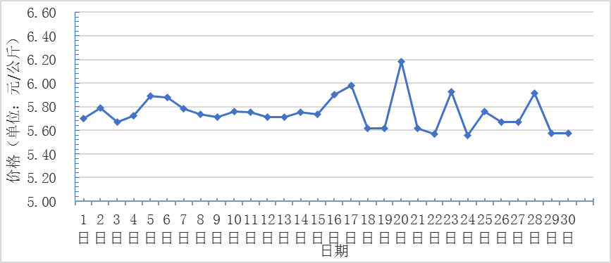 6月,全國重點(diǎn)監(jiān)測農(nóng)產(chǎn)品批發(fā)市場香蕉總交易量達(dá)2.2萬噸,同比下降4.3%,環(huán)比下降15.4%;總交易價(jià)值11480.5萬元,同比下降25.2%,環(huán)比下降12.4%。日平均價(jià)格最高為6.2元/千克,最低為5.6元/千克,全月平均價(jià)格為 5.8元/千克,同比下降13.4%,環(huán)比上漲11.5%(每日價(jià)格變化如圖)。