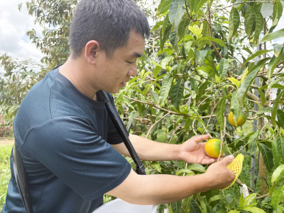 據(jù)介紹,該基地面積為360畝,于2022年引入黃晶果試種,2024年實(shí)現(xiàn)首次零星掛果?!拔覀冎饕N植的是‘黃寶石’品種,具有抗病性強(qiáng)、產(chǎn)量穩(wěn)定等特點(diǎn)。今年實(shí)現(xiàn)了穩(wěn)定掛果,每棵樹產(chǎn)量約150斤,基地年產(chǎn)量達(dá)50萬斤?!痹撠?fù)責(zé)人介紹,目前基地的黃晶果尚處于初產(chǎn)期,到2026年將迎來豐產(chǎn)期,產(chǎn)量預(yù)計(jì)將有進(jìn)一步的提升。