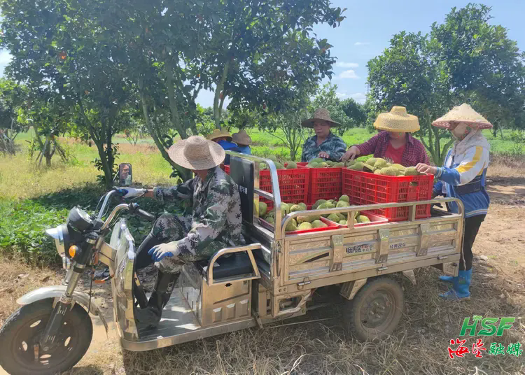 近日,在八一總場公司老根466畝榴蓮蜜基地,有的工人手持剪刀將樹上一個個果型飽滿的榴蓮蜜剪下來,有的工人將榴蓮蜜分揀到籮筐里,還有的工人騎著三輪車將一筐筐果實運送集中起來,整個基地洋溢著豐收的喜悅。