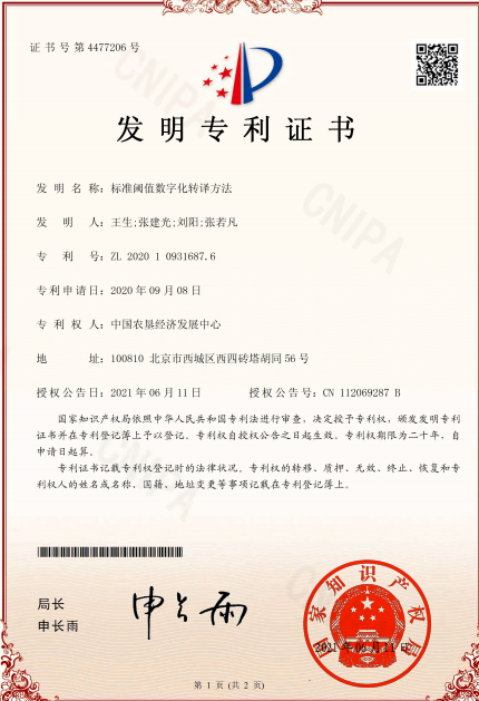 5. 2021年6月,信息服務(wù)處成功申請《標(biāo)準(zhǔn)閾值數(shù)字化轉(zhuǎn)譯方法》專利技術(shù),創(chuàng)造性地將產(chǎn)地環(huán)境標(biāo)準(zhǔn)、生產(chǎn)標(biāo)準(zhǔn)、產(chǎn)品標(biāo)準(zhǔn)等進(jìn)行數(shù)字化轉(zhuǎn)譯,將書面標(biāo)準(zhǔn)轉(zhuǎn)化為信息系統(tǒng)可識別的數(shù)字標(biāo)準(zhǔn),從而實(shí)現(xiàn)精準(zhǔn)質(zhì)量控制。目前已在多家農(nóng)墾企業(yè)的全面質(zhì)量管理數(shù)字化項目中應(yīng)用,涵蓋種植業(yè)、畜牧業(yè)、漁業(yè)等產(chǎn)業(yè),在推動企業(yè)智能化質(zhì)量安全監(jiān)管、提升產(chǎn)品質(zhì)量等方面發(fā)揮了巨大作用。