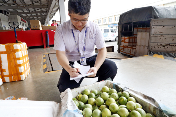 工作人員正在對(duì)百香果開箱檢查。黃求玉攝