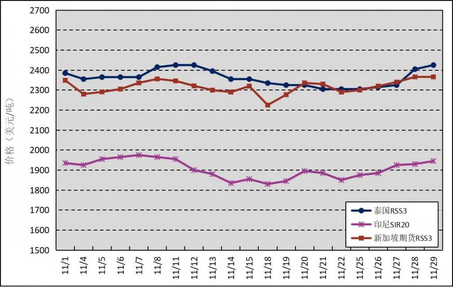 國外主產(chǎn)區(qū):11月,泰國RSS3平均價格為2361美元/噸,環(huán)比下跌354美元/噸,最高價為2425美元/噸,最低價為2305美元/噸;印尼SIR20平均價格為1905美元/噸,環(huán)比下跌51美元/噸,最高價為1975美元/噸,最低價為1830美元/噸;新加坡RSS3期貨主力合約月均結(jié)算價格為2316美元/噸,環(huán)比下跌261美元/噸,最高價為2366美元/噸,最低價為2225美元/噸。