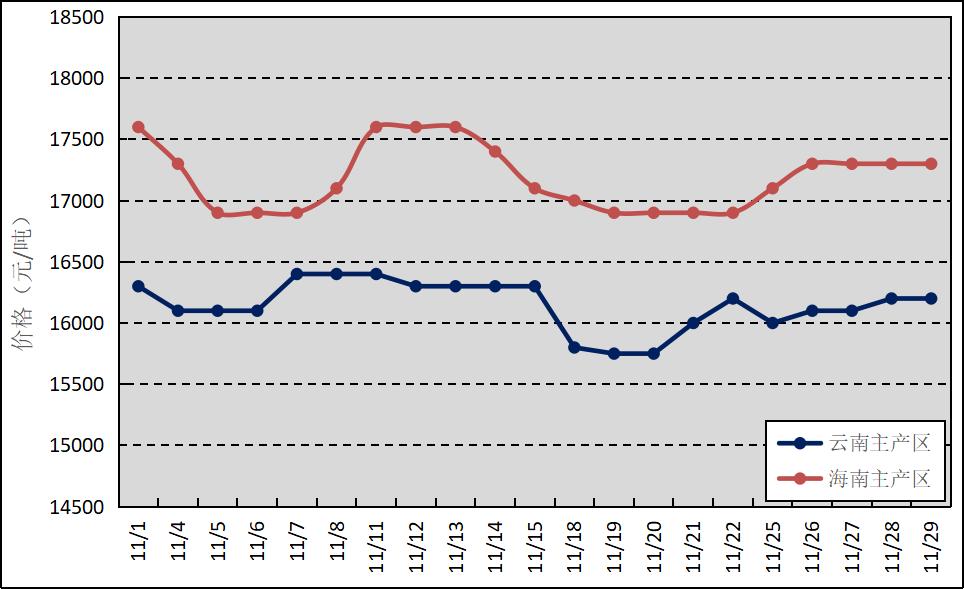 國內(nèi)主產(chǎn)區(qū):11月,云南大部分產(chǎn)區(qū)月底停割,海南產(chǎn)區(qū)正常開展割膠。云南、海南鮮膠乳(折干膠)月均價格分別為16148元/噸、17186元/噸,環(huán)比下跌496元/噸、1464元/噸。