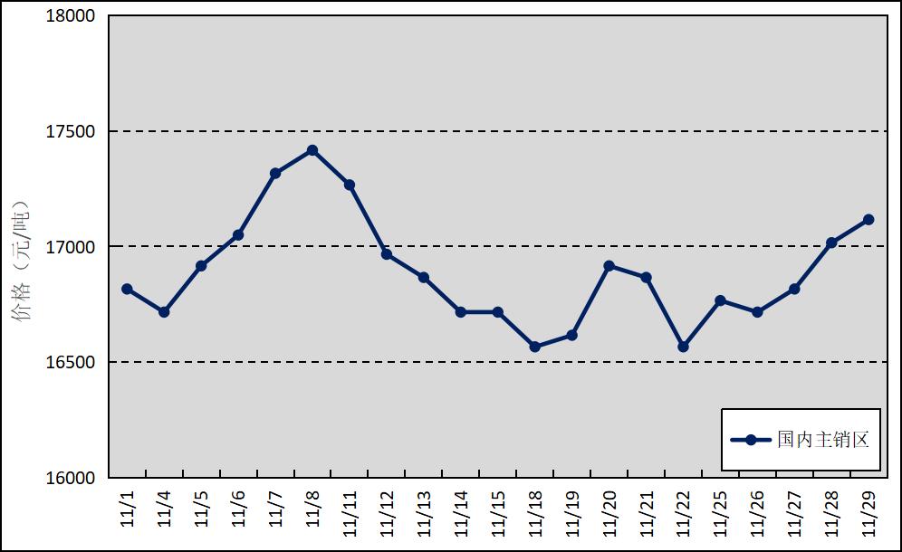 國內(nèi)主銷區(qū):11月,上海、青島和天津等銷區(qū)市場的國產(chǎn)全乳標準膠平均價格為16892元/噸,環(huán)比下跌209元/噸,最高價為17417元/噸,最低價為16567元/噸。
