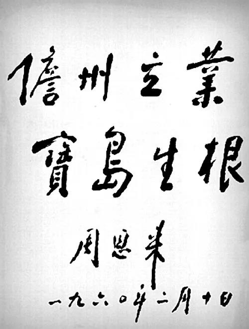 因為兩院是從廣州搬下來的,儋縣是個小縣城,因此兩院的領(lǐng)導(dǎo)班子提出要在寶島安家生根的口號。隨后我請總理題詞。總理就改了我的對聯(lián)兩個字,寫下了“儋州立業(yè),寶島生根”??偫淼牧I(yè)生根親筆題詞,對從廣州來的專家、教授、學(xué)生鼓勵很大。當(dāng)時我們把總理的題詞寫成大標語掛在研究大樓上,在兩院進行生根立業(yè)教育,使兩院的廣大師生深受鼓舞。