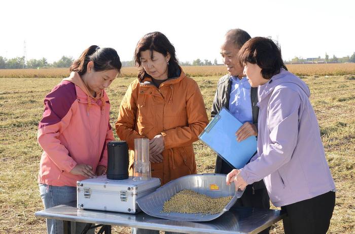 關(guān)二騰的大豆田位于新疆農(nóng)墾科學(xué)院與一四七團(tuán)共同打造的“新大豆 23 號(hào)”千畝高產(chǎn)創(chuàng)建示范田內(nèi)。9 月 19 日,來自中國(guó)農(nóng)業(yè)科學(xué)院、河北省農(nóng)林科學(xué)院、新疆農(nóng)業(yè)科學(xué)院、新疆農(nóng)業(yè)大學(xué)、兵團(tuán)農(nóng)業(yè)技術(shù)推廣總站的專家們組成專家組,進(jìn)行實(shí)收產(chǎn)量鑒定。在百畝方實(shí)打?qū)嵤?22.55 畝,平均畝產(chǎn) 439.17 公斤;千畝方實(shí)打?qū)嵤?163.98 畝,平均畝產(chǎn) 400.05 公斤。反復(fù)測(cè)算核對(duì)后,中國(guó)農(nóng)業(yè)科學(xué)院油料作物研究所研究員周新安宣布:“兵團(tuán)春大豆百畝方和千畝方單產(chǎn)雙雙創(chuàng)下全國(guó)紀(jì)錄,全國(guó)大豆大面積單產(chǎn)新紀(jì)錄誕生?!?