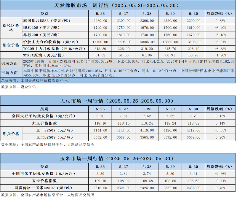 天然橡膠、大豆、玉米市場(chǎng)一周行情(2025.05.26-05.30)