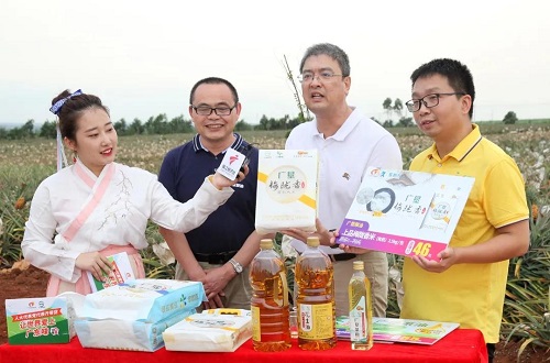 在廣東省紅星農(nóng)場(chǎng)直播分會(huì)場(chǎng),黨的十九大代表、廣東廣墾華豐糖業(yè)有限公司黨群工作部副部長(zhǎng)陳燕華,廣東省人大代表、湛江市飲食服務(wù)業(yè)商會(huì)、湛江市烹飪行業(yè)協(xié)會(huì)常務(wù)副會(huì)長(zhǎng)梁思橋走進(jìn)“菠蘿的海”,為菠蘿、火龍果、山茶油等廣墾良品直播帶貨。