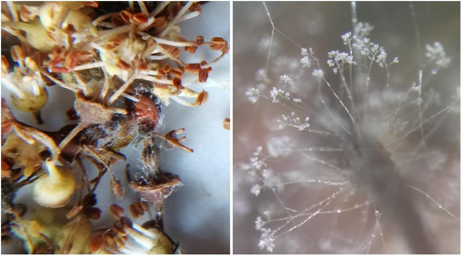 圖2 室溫下保濕一晚荔枝小花上長(zhǎng)出的白色霉?fàn)钗铮ㄗ螅┘安≡敝丑w(右)