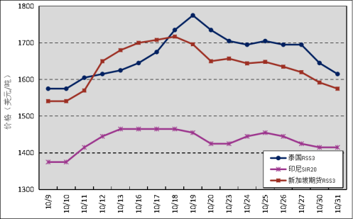 國外主產(chǎn)區(qū):10月,泰國RSS3平均價格為1666美元/噸,環(huán)比上漲83美元/噸,最高價為1775美元/噸,最低價為1575美元/噸;印尼SIR20平均價格為1434美元/噸,環(huán)比上漲39美元/噸,最高價為1465美元/噸,最低價為1375美元/噸;新加坡RSS3期貨主力合約月均結算價格為1637美元/噸,環(huán)比上漲73美元/噸,最高價為1717美元/噸,最低價為1541美元/噸。