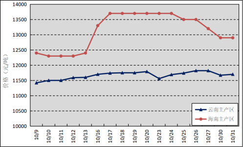 國內主產(chǎn)區(qū):10月,云南產(chǎn)區(qū)割膠工作正常開展,原料供應較為充足;海南產(chǎn)區(qū)降雨相對頻繁,膠水產(chǎn)出偏少。云南和海南原料膠(折干膠)月均價格分別為11667元/噸、13129元/噸,環(huán)比上漲90元/噸、709元/噸。