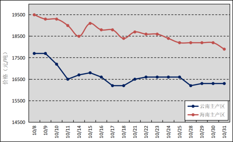 國(guó)內(nèi)主產(chǎn)區(qū):10月,除云南部分產(chǎn)區(qū)因季風(fēng)性落葉病暴發(fā)、海南部分產(chǎn)區(qū)受下旬降水?dāng)_動(dòng)明顯增多影響割膠作業(yè)外,國(guó)內(nèi)大部分產(chǎn)區(qū)割膠工作正常開展,膠乳產(chǎn)量逐步增加。云南、海南鮮膠乳(折干膠)月均價(jià)格分別為16644元/噸、18650元/噸,環(huán)比上漲901元/噸、2845元/噸。