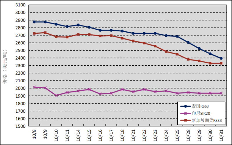 國(guó)外主產(chǎn)區(qū):10月,泰國(guó)RSS3平均價(jià)格為2715美元/噸,環(huán)比下跌68美元/噸,最高價(jià)為2875美元/噸,最低價(jià)為2395美元/噸;印尼SIR20平均價(jià)格為1956美元/噸,環(huán)比上漲77美元/噸,最高價(jià)為2015美元/噸,最低價(jià)為1905美元/噸;新加坡RSS3期貨主力合約月均結(jié)算價(jià)格為2577美元/噸,環(huán)比下跌128美元/噸,最高價(jià)為2734美元/噸,最低價(jià)為2330美元/噸。