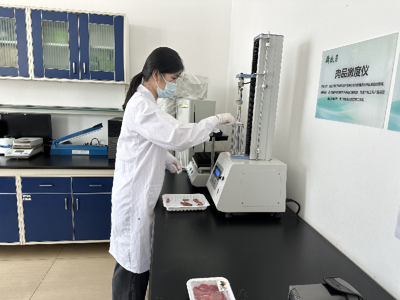 月盛齋公司為了守護(hù)舌尖上的安全與美味也做了不少工作。在肉品檢測(cè)中心,實(shí)驗(yàn)員對(duì)新入廠(chǎng)的牛羊肉進(jìn)行檢驗(yàn),將其提取物滴在檢測(cè)試紙上,對(duì)磺胺類(lèi)、喹諾酮類(lèi)等農(nóng)獸藥殘留進(jìn)行精準(zhǔn)檢測(cè),把好食材“入廠(chǎng)關(guān)”。工作人員還會(huì)對(duì)生產(chǎn)加工過(guò)程中的環(huán)境、物品進(jìn)行取樣,并對(duì)其大腸桿菌、菌落總數(shù)、致病菌等微生物進(jìn)行檢測(cè),把好生產(chǎn)加工過(guò)程的“衛(wèi)生關(guān)”。在提升產(chǎn)品質(zhì)量方面,他們用數(shù)據(jù)“說(shuō)話(huà)”,通過(guò)指標(biāo)測(cè)定直觀(guān)地為生產(chǎn)加工和產(chǎn)品研發(fā)提供參考。例如,“嫩度”是肉品食用品質(zhì)中的重要指標(biāo)之一,不僅決定牛肉質(zhì)量,也是消費(fèi)者和加工者最為重視的性質(zhì)之一。在實(shí)驗(yàn)室里,實(shí)驗(yàn)員通過(guò)儀器剪切樣品時(shí)產(chǎn)生剪切力數(shù)值判斷肉品不同部位、不同烹飪方式的嫩度,便于確定更適宜的加工方式,以達(dá)到最佳口感。