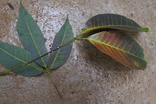 季風(fēng)性落葉病可危害橡膠樹葉片、嫩枝和膠果。嫩葉感病初期呈暗綠色水漬狀病斑,隨后變黑,凋萎脫落,新落的病葉一般葉色濃綠新鮮、葉面無其他異?,F(xiàn)象,若將葉柄剖開,可見髓部變?yōu)楹诤稚?;老葉的典型癥狀一般是葉柄基部先感病,初期呈水漬狀黑色條斑,病部溢出1-2滴凝膠,凝膠初為白色,后變黑。嚴(yán)重發(fā)生時,病斑在葉柄上擴(kuò)展,整個葉片連同葉柄很快脫落。枝條感病后,在綠色部分出現(xiàn)凝膠和水漬狀暗斑,隨后回枯變褐色,葉片凋萎下垂,掛在干枝上不易脫落。