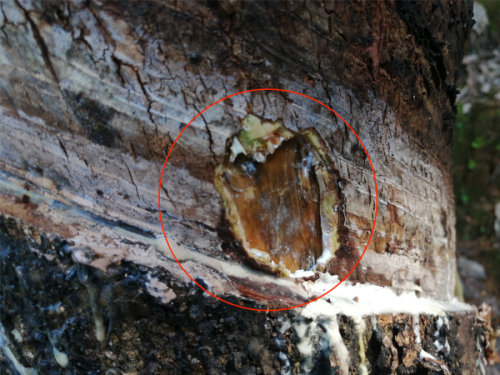 割面條潰瘍病主要危害割面,每年3-12月均可發(fā)生,發(fā)病初期在橡膠樹割面新割線上出現(xiàn)一條至數(shù)條排列成柵欄狀的豎立黑線,深達(dá)木質(zhì)部。黑線繼續(xù)擴(kuò)展成病斑或塊斑,天氣潮濕時,病斑表面長出白色霉?fàn)钗?。皮下溢膠可導(dǎo)致皮層爆裂、隆起,木質(zhì)部變黑褐色。
