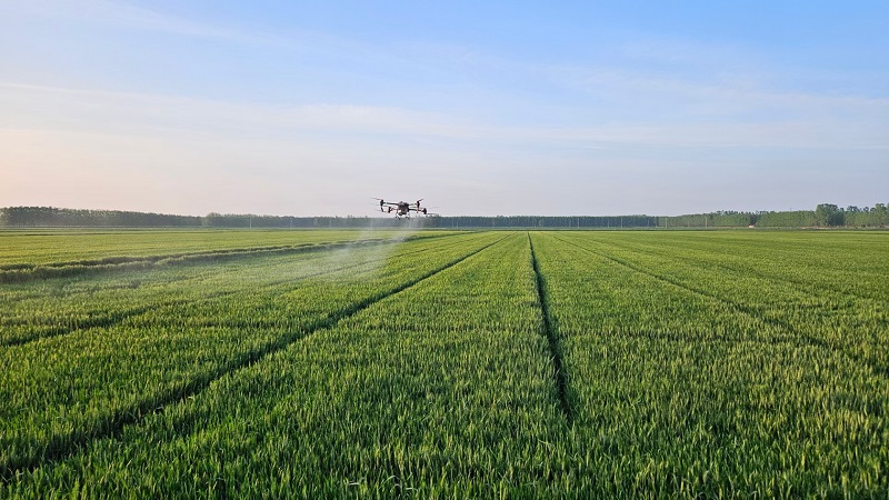 在東陬生產(chǎn)區(qū),一片片綠油油的麥苗煥發(fā)著勃勃生機(jī)。3 臺植保無人機(jī)在操作人員的精準(zhǔn)操控下,沿著預(yù)設(shè)航線輕盈穿梭,細(xì)密的藥液均勻播灑。“如今無人機(jī)打藥僅需用水 3.5升,既能實現(xiàn)全面透徹、無重復(fù)無遺漏的噴灑效果,又能精準(zhǔn)把控藥量,避免農(nóng)藥浪費(fèi),實現(xiàn)降本增效的目的,作業(yè)成效十分顯著?!鄙a(chǎn)區(qū)技術(shù)員喬文忠說。