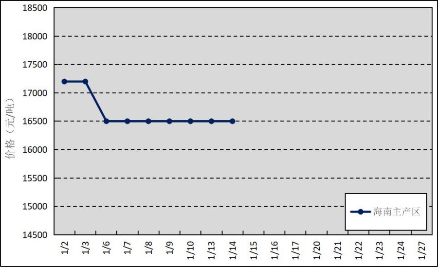 國內(nèi)主產(chǎn)區(qū):1月中旬,海南產(chǎn)區(qū)停割,至此國內(nèi)膠園全部進(jìn)入停割期。海南原料膠(折干膠)月均價格為16656元/噸,環(huán)比下跌626元/噸。