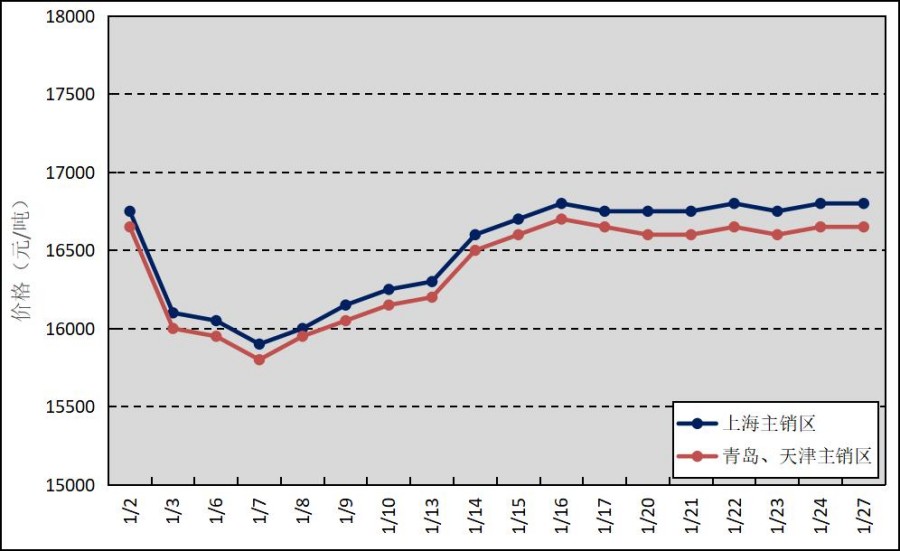 國內(nèi)主銷區(qū):1月,國產(chǎn)全乳標(biāo)準(zhǔn)膠上海市場平均價格16500元/噸,環(huán)比下跌736元/噸,最高價為16800元/噸,最低價為15900元/噸;青島市場和天津市場平均價格16386元/噸,環(huán)比下跌764元/噸,最高價為16700元/噸,最低價為15800元/噸。