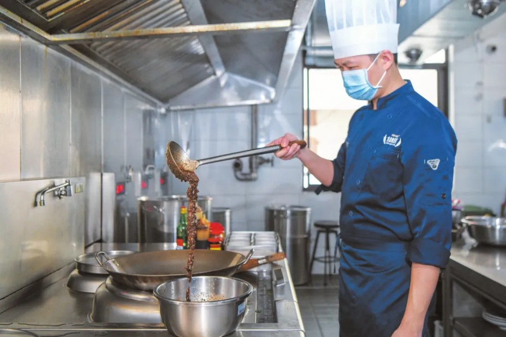 在金盤食驗(yàn)室的后廚,工作人員正在加工胡椒益智辣椒醬。海口日報記者 蘇弼坤 攝